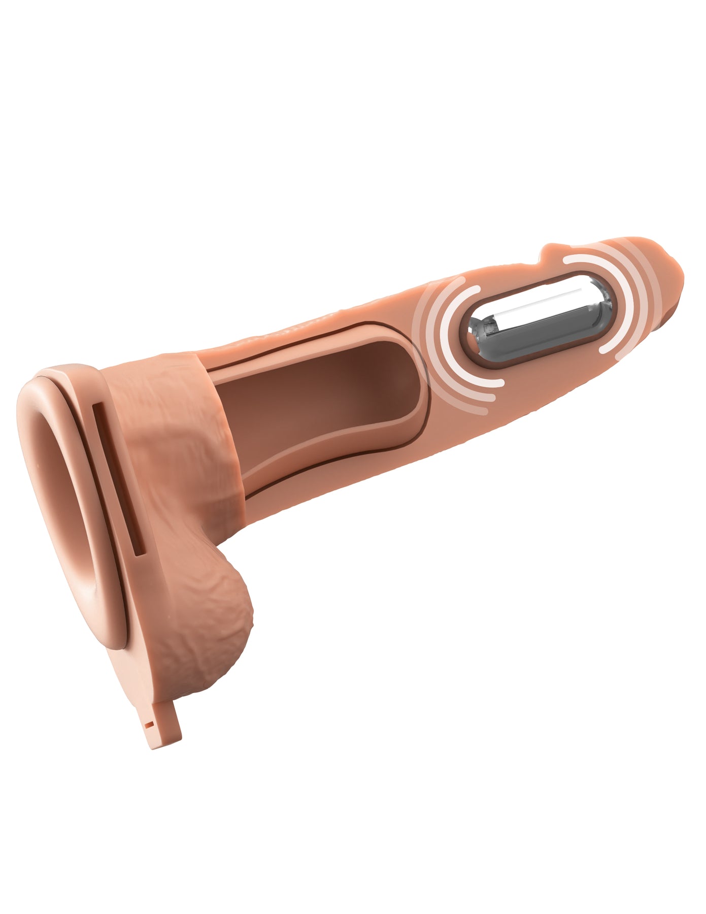 This Vibrating Xtensions model includes molded balls and an integrated rechargeable motor that sends vibration directly to the tip of the dildo—right where many partners feel it most strongly. The motor features 10 vibration functions to enhance stimulation during thrusting.