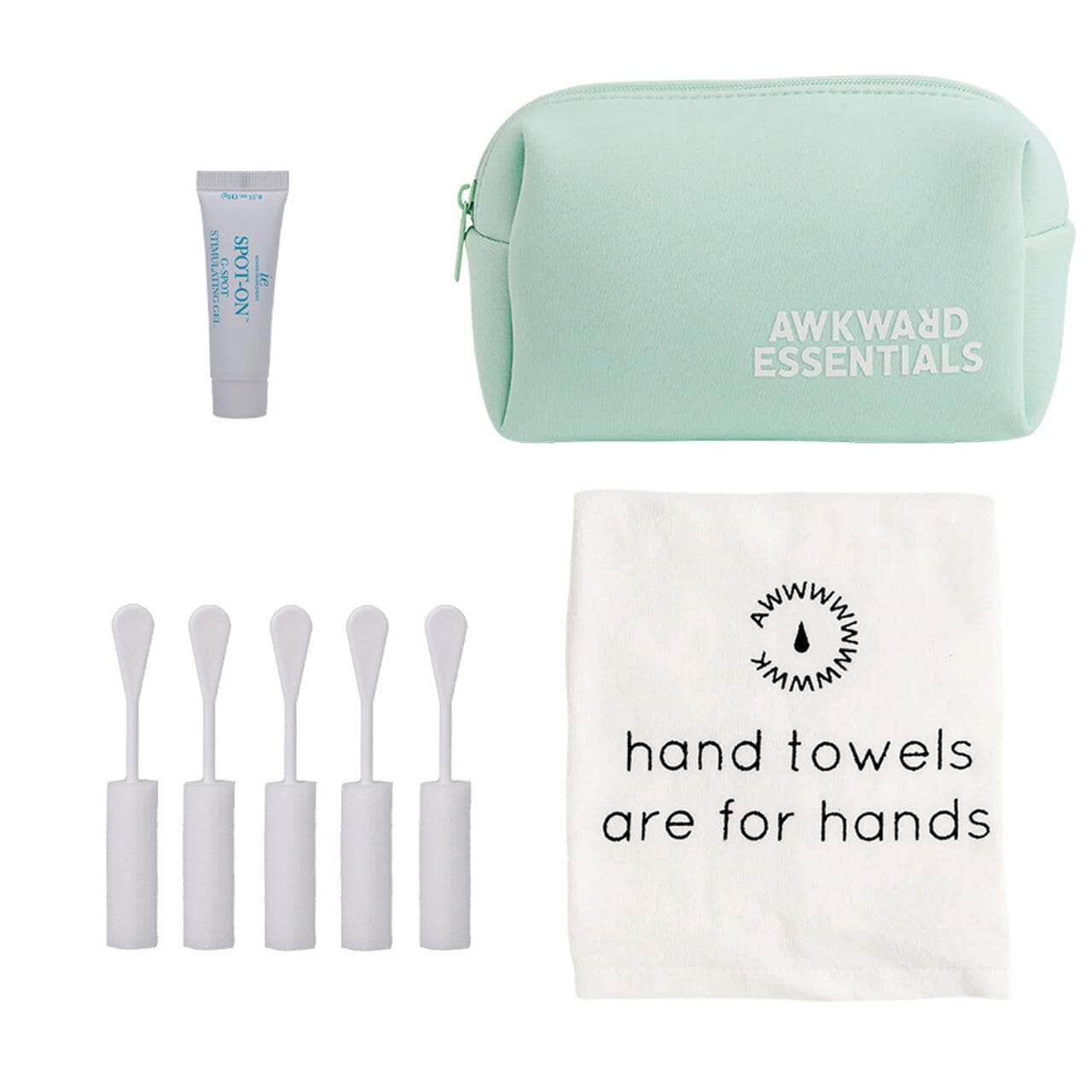 This Awkward Essentials Starter Set includes 5 single-use sponges, 1 tube G-spot gel, a small towel, and an easy zippered storage bag (reuseable).