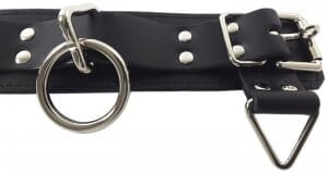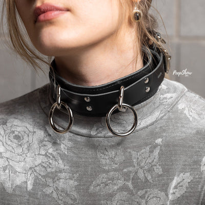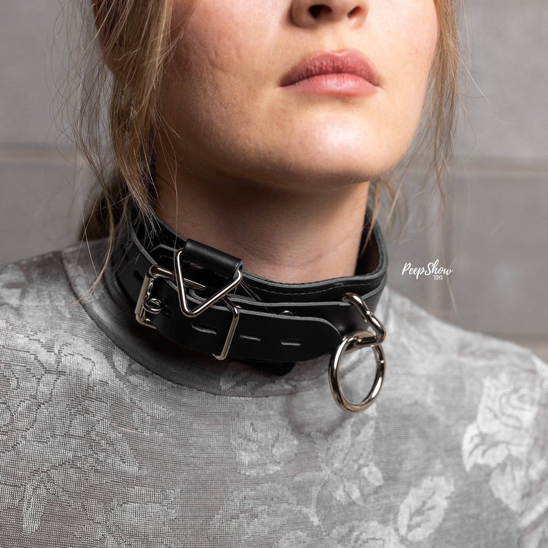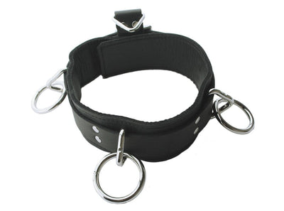 This deluxe 3-Ring Leather Collar is lockable, and features 3 different D-rings to keep your sub securely bound.