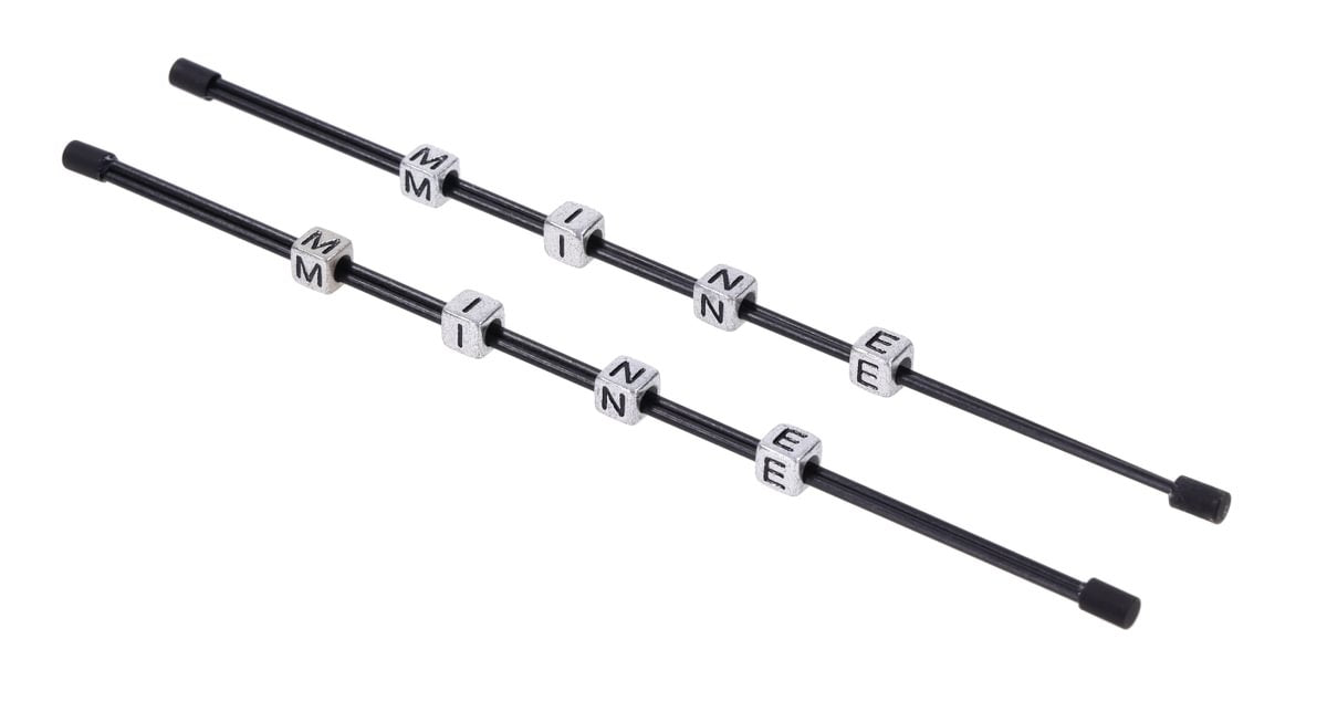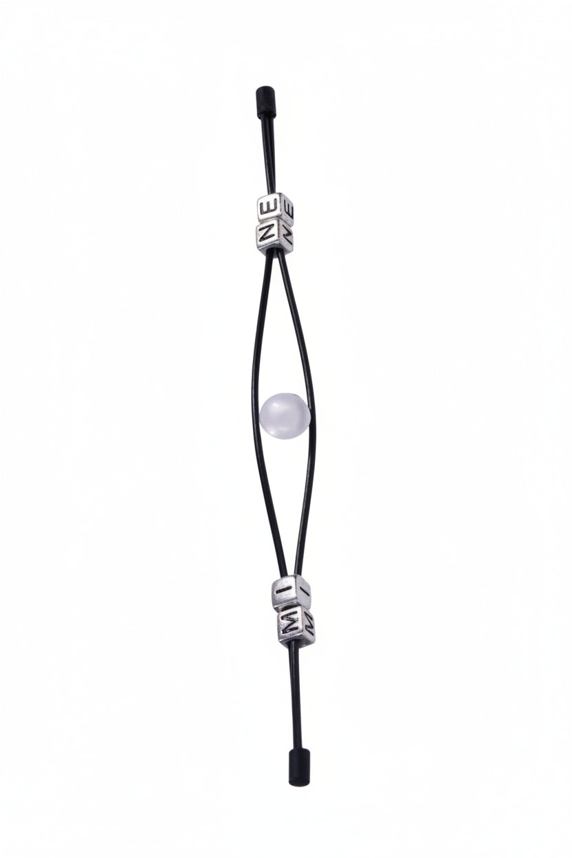 Finished in sleek black, the rods flex slightly to maintain steady tension. Four silver cubes engraved with letters spelling M-I-N-E move smoothly along the rods, increasing pressure as they approach the center point.