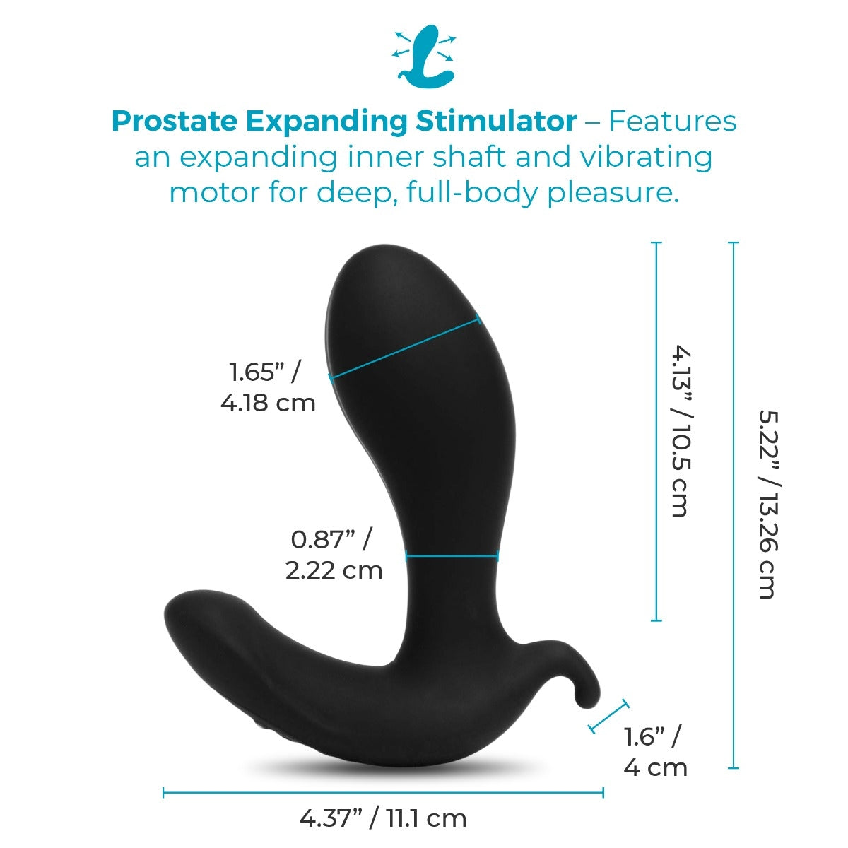 Dimensions: 5.22” (13.26 cm) total length; 4.13” (10.5 cm) insertable length; 1.65” (4.18 cm) widest diameter at prostate bulb; 0.87” (2.22 cm) neck diameter; 4.37” (11.1 cm) base width.