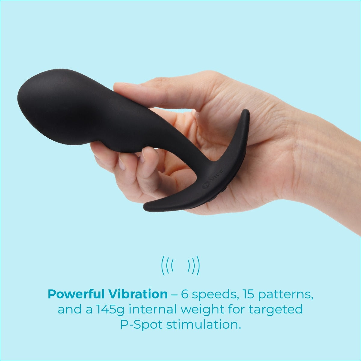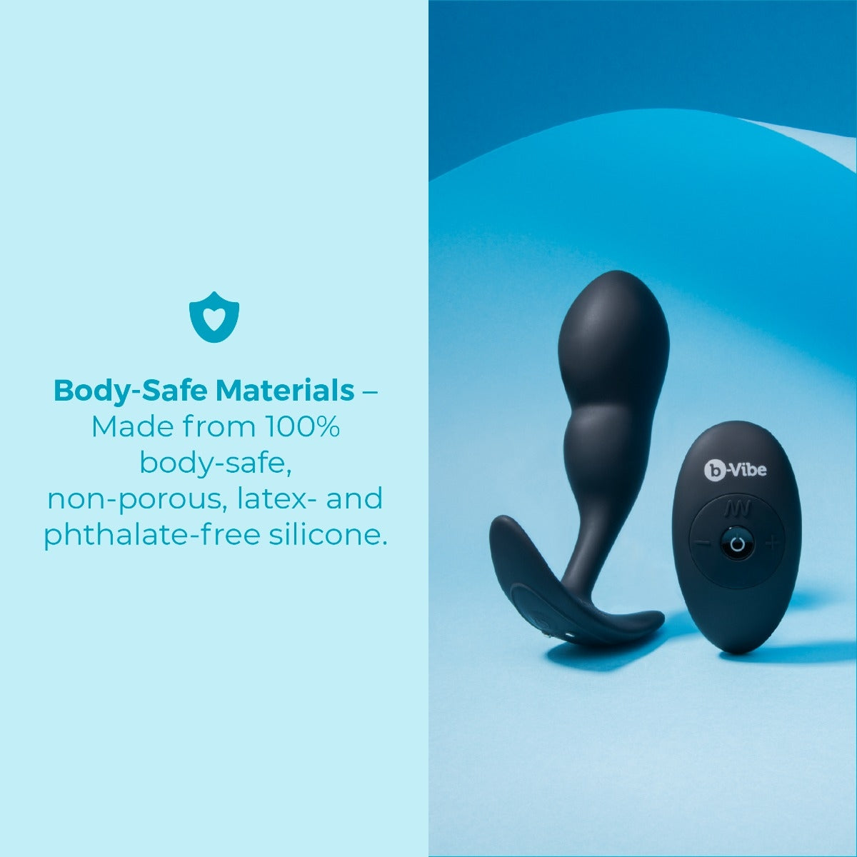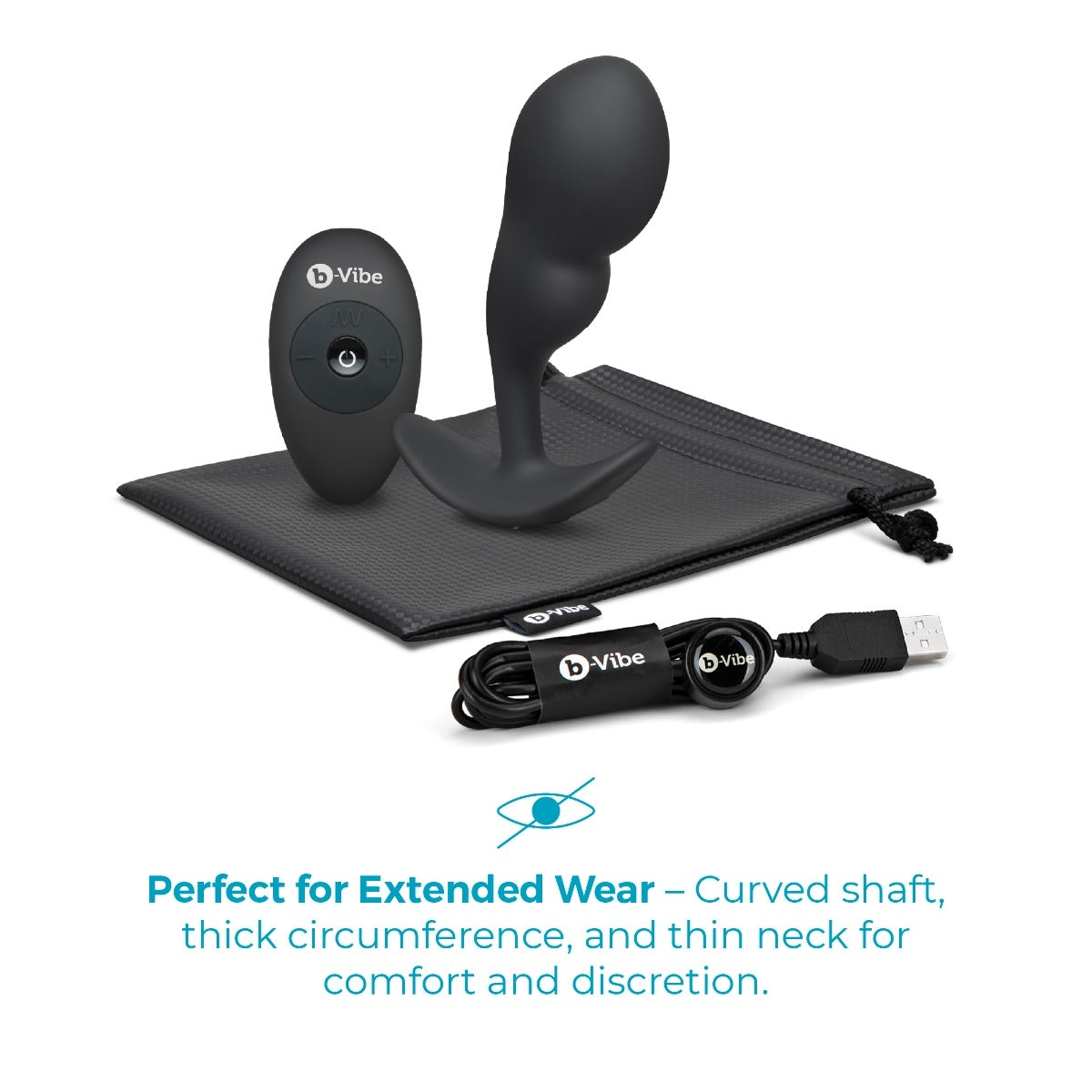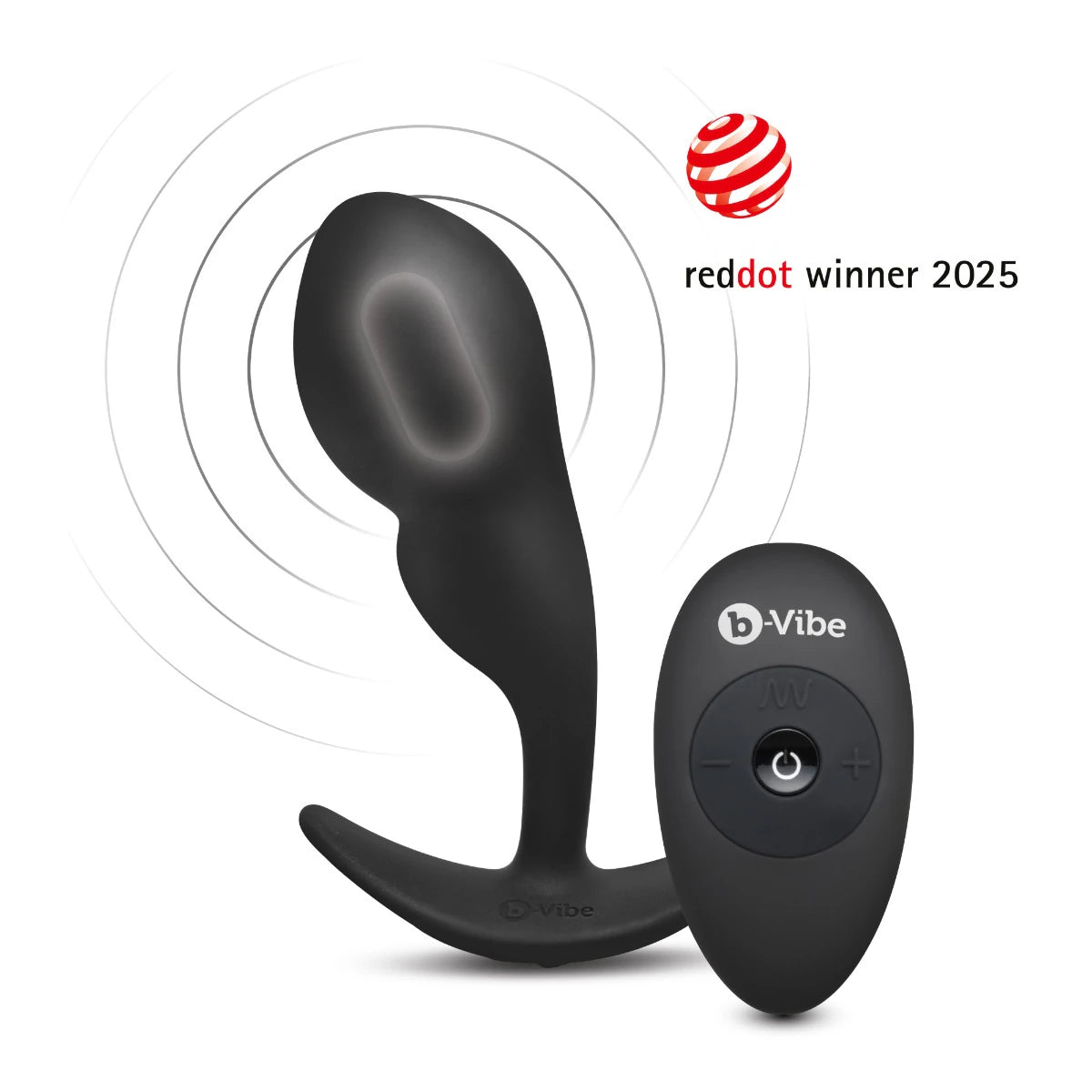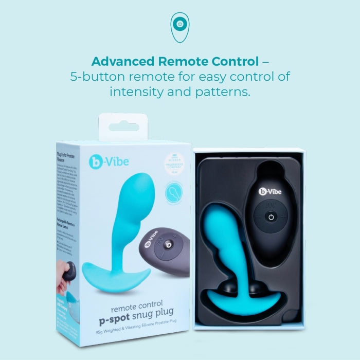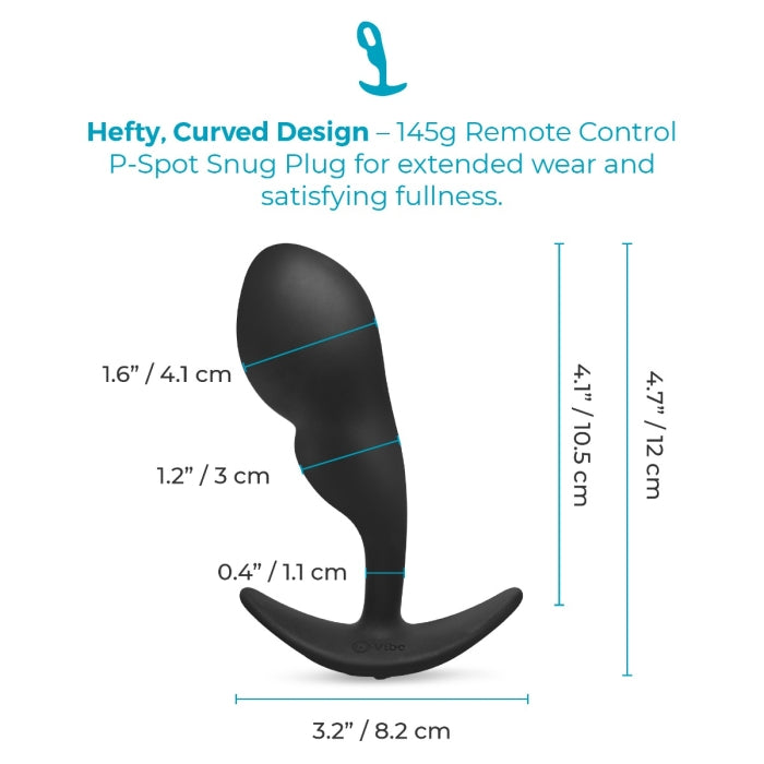 A vibrating butt plug contoured for prostate play, the Remote Control P-spot Plug by b-Vibe is available in your choice of 2 sizes (1 per Add to Cart, not a 2-pack kit): smaller is 95g weight & 1.3" max. diameter, in blue; larger size is 145g weight & 1.6" max. diameter, in black.