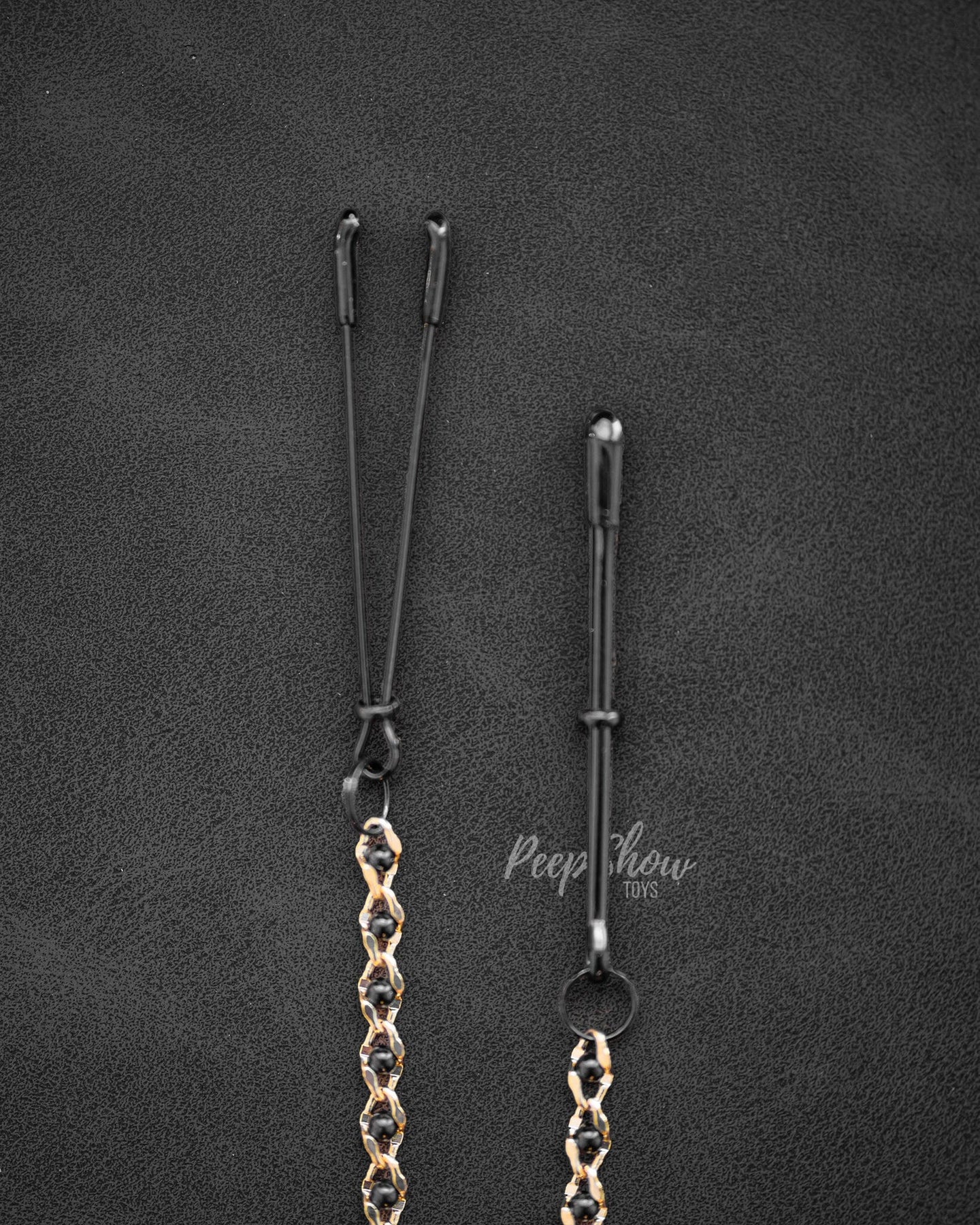 Beginner-friendly, the "Tweezer Tip Clamps Black Link Chain" are make for sexy display! They have padded tips for comfort around the nipples. Made by Spartacus.