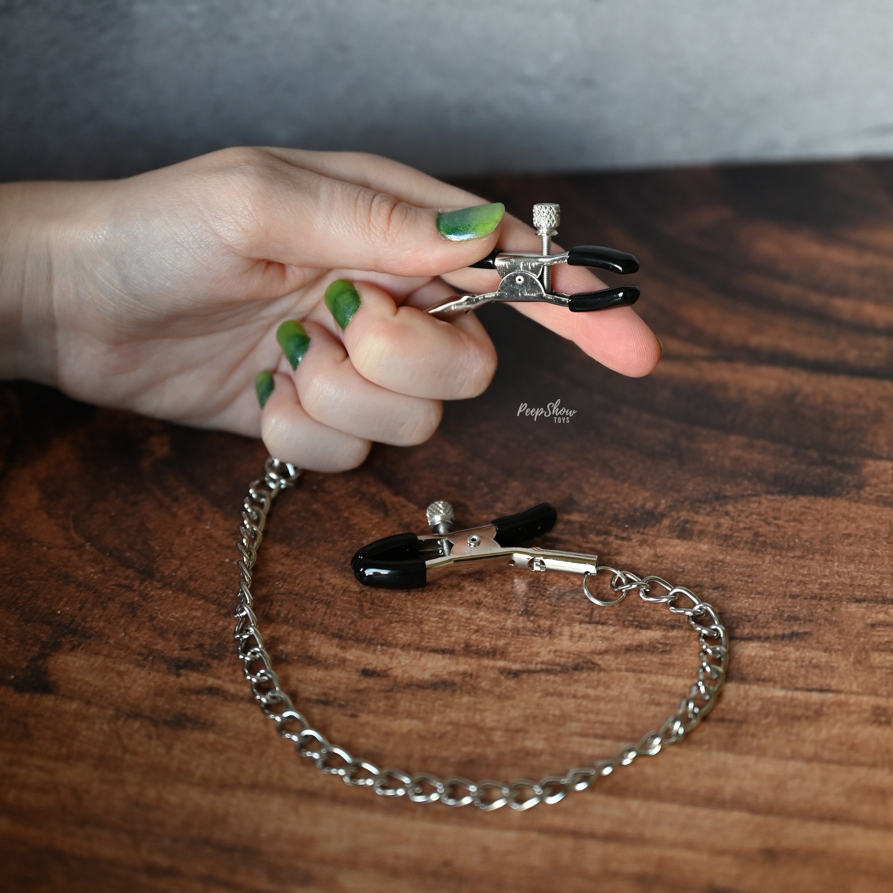 Classic, adjustable nipple clamps are joined by a dangling chain between the breasts!