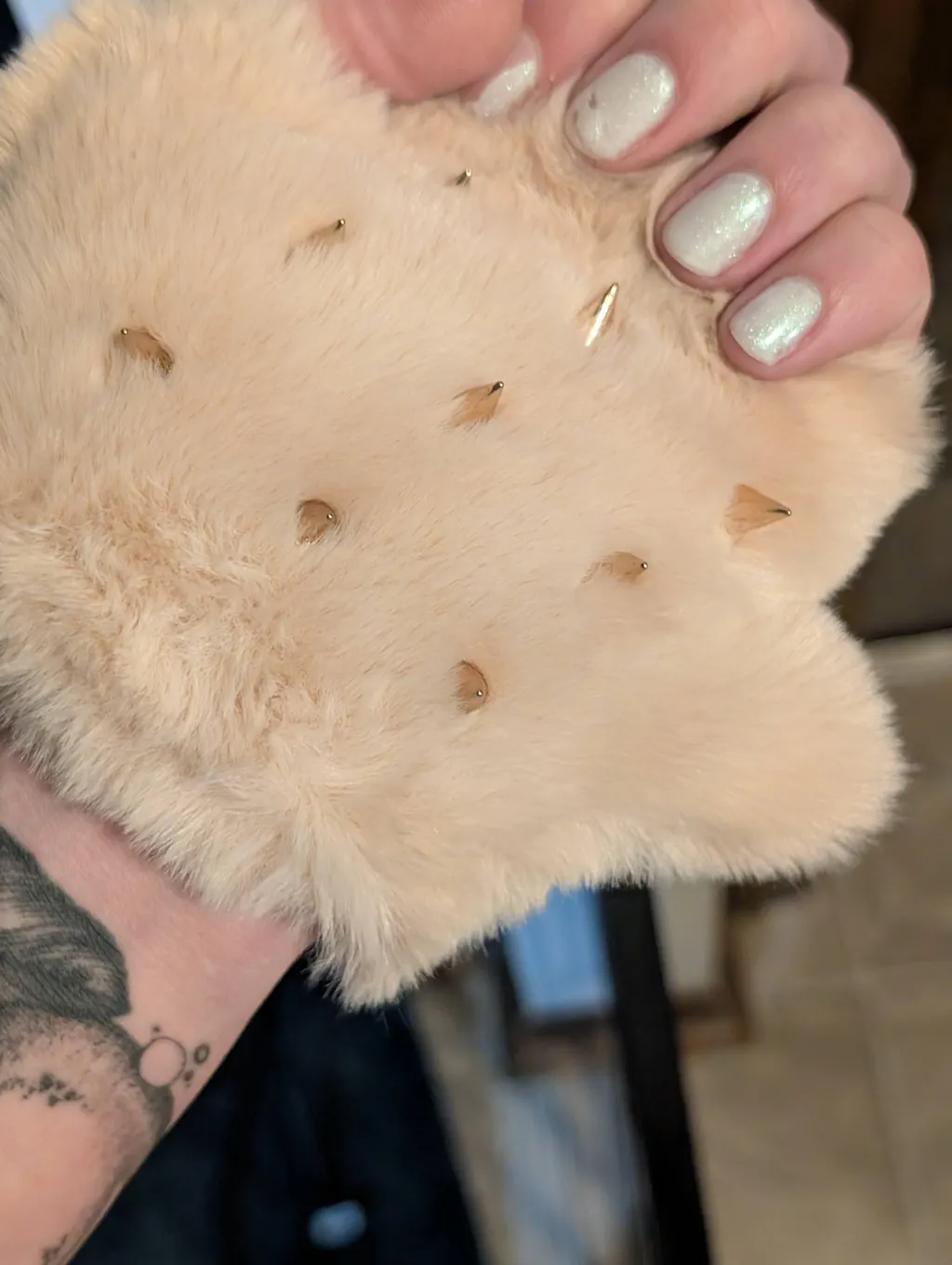 One side is cute glittery stretch fabric, while the underside holds both supple fur and 9 metallic points!
