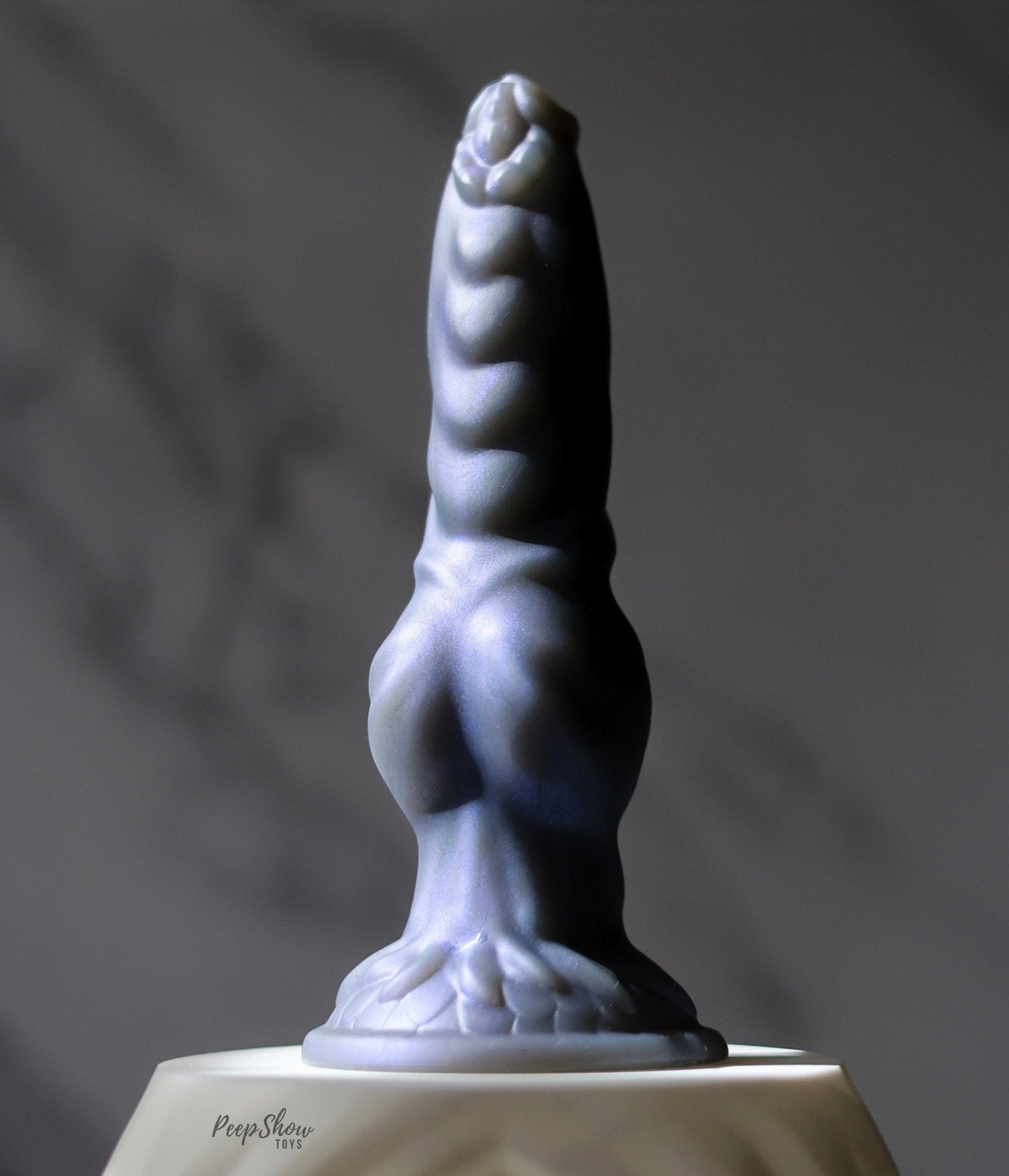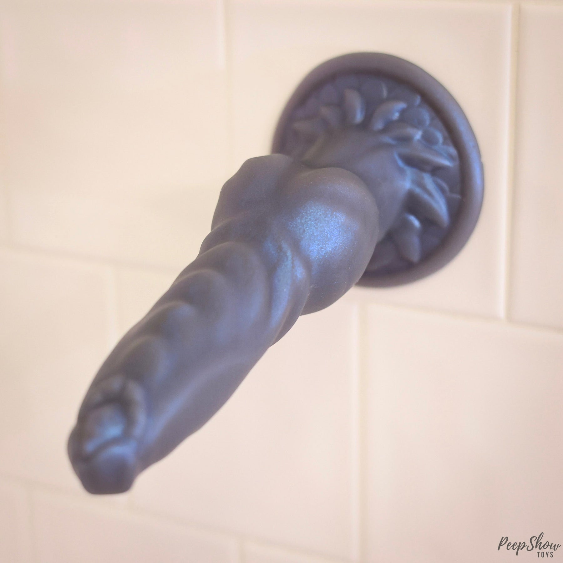 The Gnarr dildo's microfine deep blue glimmers in the light, changing how Gnarr looks in bright light, normal light, and dim light: expose it to sunlight streaming in through your window for the full glimmer effect.