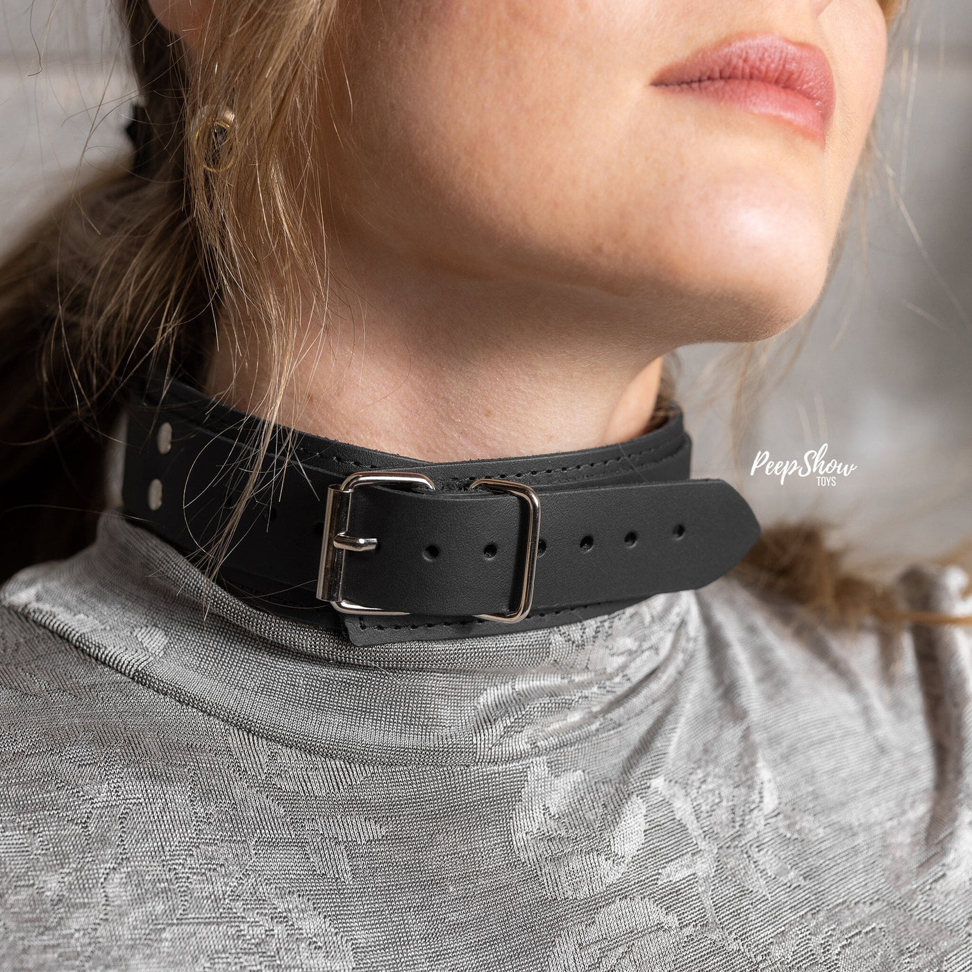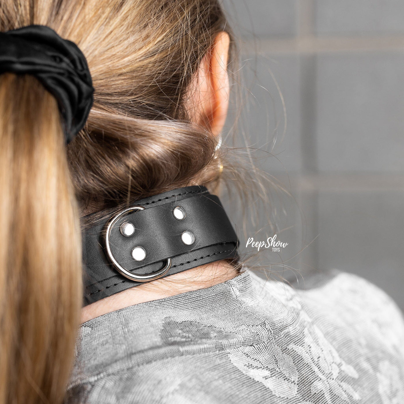 The collar includes a D-ring outside, for adding a leash or other restraints later. Easily wearable in the day, and perfect for dom/sub play at night!