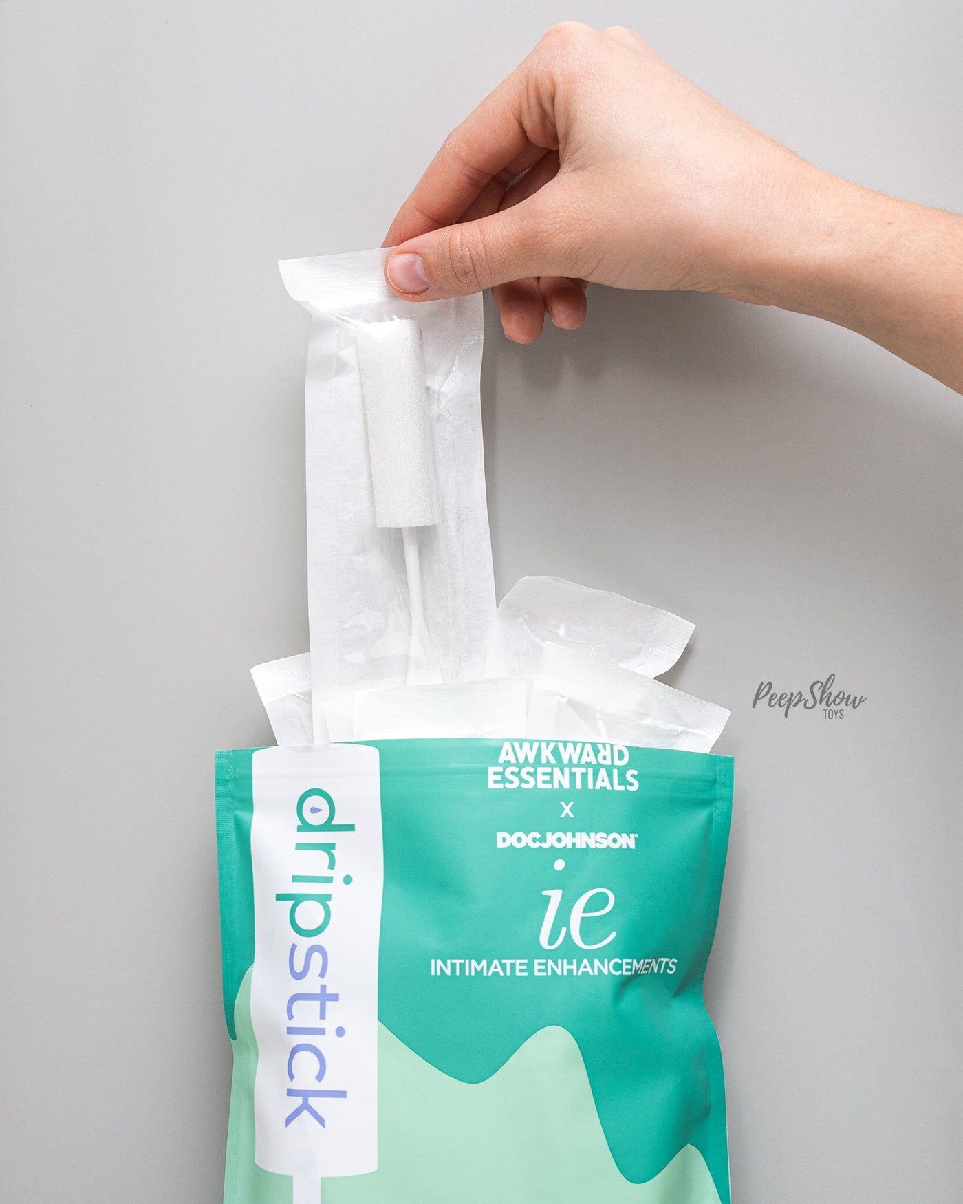 This Awkward Essentials Dripstick kit includes 12 pieces. Single-use. Perfect for traveling and cleanup on the go: Each sponge is individually wrapped!