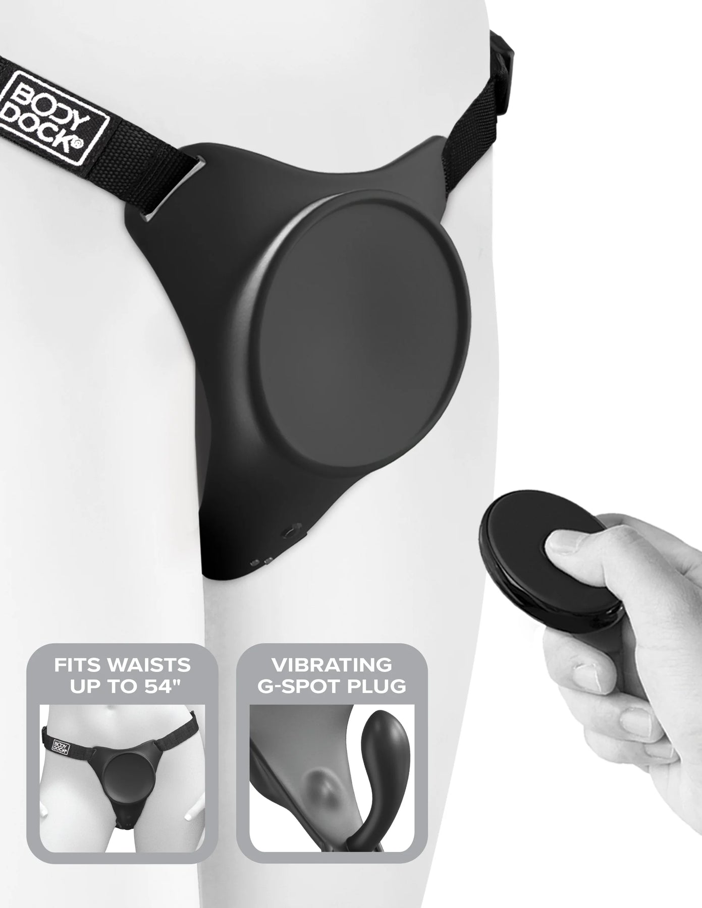 Choose your own dildo: The BodyDock harness fits any dildo with a suction cup base 3.4" diameter or less. The harness straps adjust to fit waists between 24" and 56". Dildo not included.