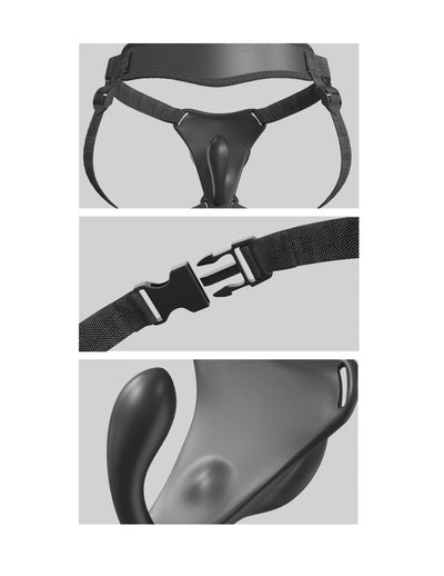 Poised for double the pleasure! The Body Dock G-Spot Pro harness kit includes a vibrating G-spot vagina plug that fits seamlessly into the strap-on: