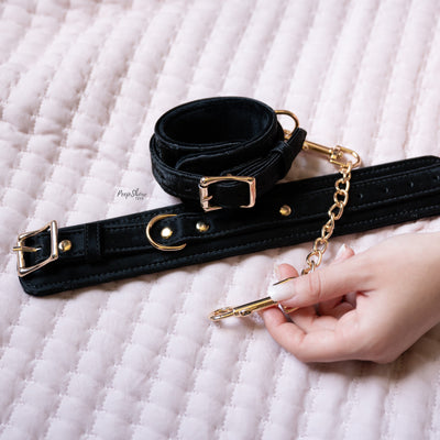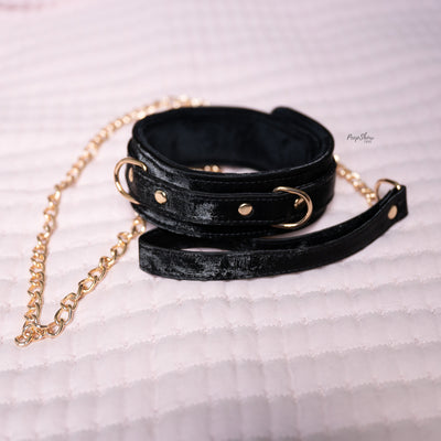 A supple collar, the Boudoir Amor Collar with Leash offers a softer feel as you play. Its nickel-free, golden metal is sturdy plus looks sexy in the 3 different rings + studs anchored around their neck.