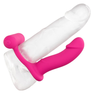 This hands-free stimulator fits over an erect penis, allowing you to DP your partner — anal + vaginal penetration simultaneously.