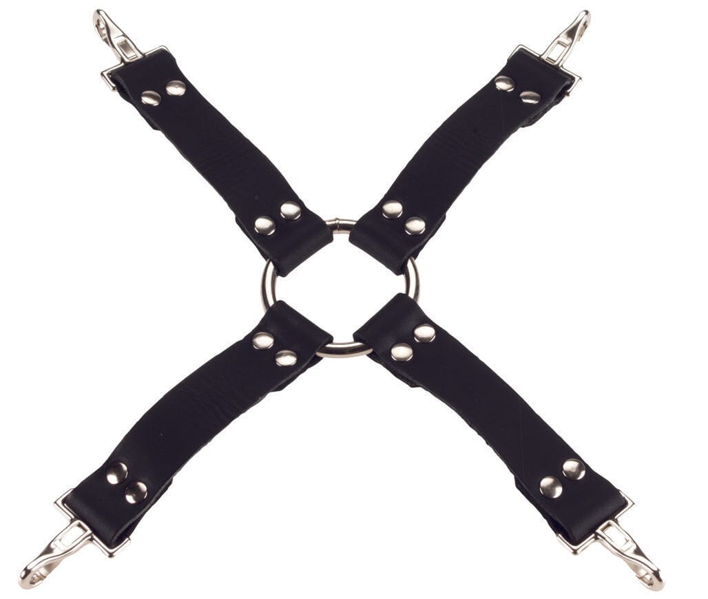 The Hogtie's four leather straps connect to a central O-ring, made of nickel-free metal. A snap-clip ends each leather strap, for binding all four limbs together.