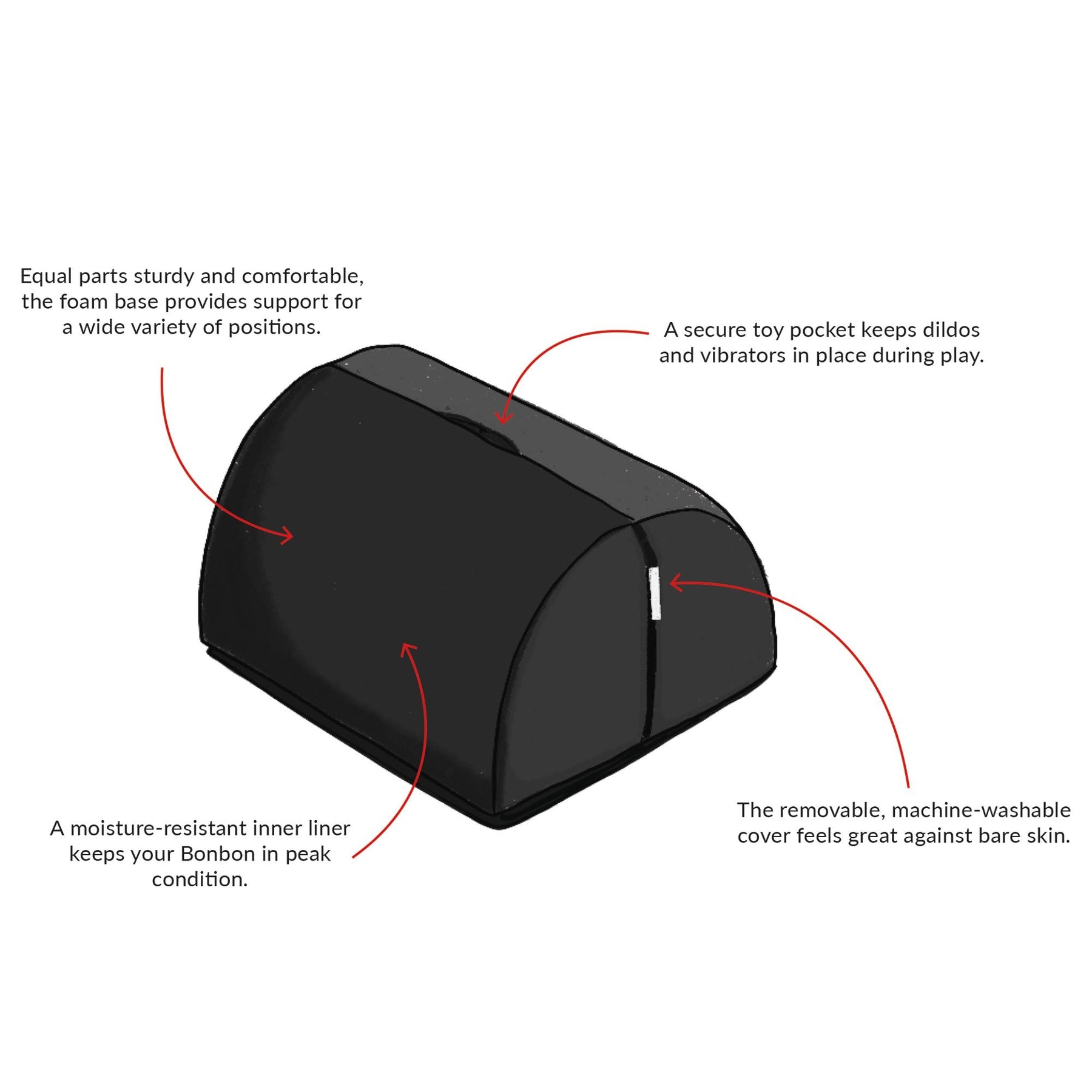 Made of a high-quality, super-dense foam, Liberator pillows are designed to hold their shape when you put your full weight on them. Their velvety outer cover is removable and machine-washable, while the satin lining underneath helps keep your BonBon dry.