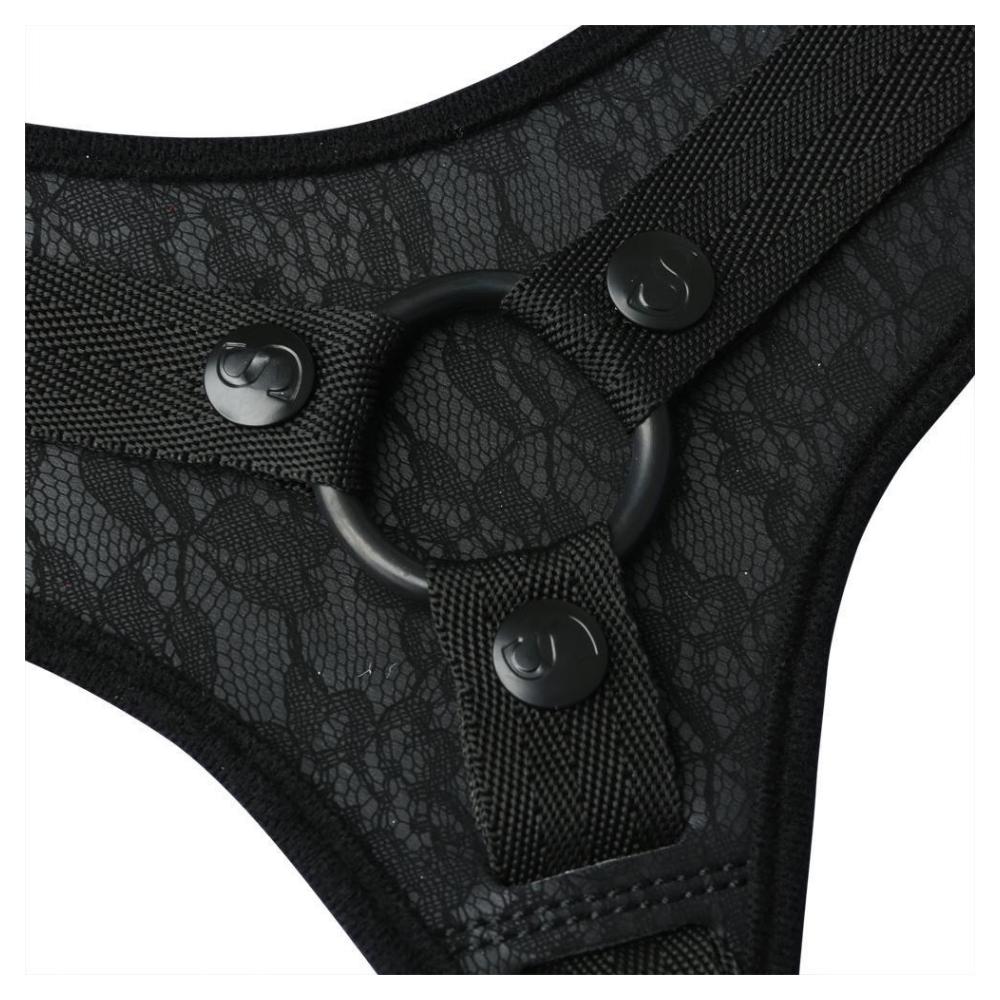 The velvety, fine lace fabric of this strap-on is part of the pleasure as it comfortably hugs your contours. Keeps your toy securely in place.