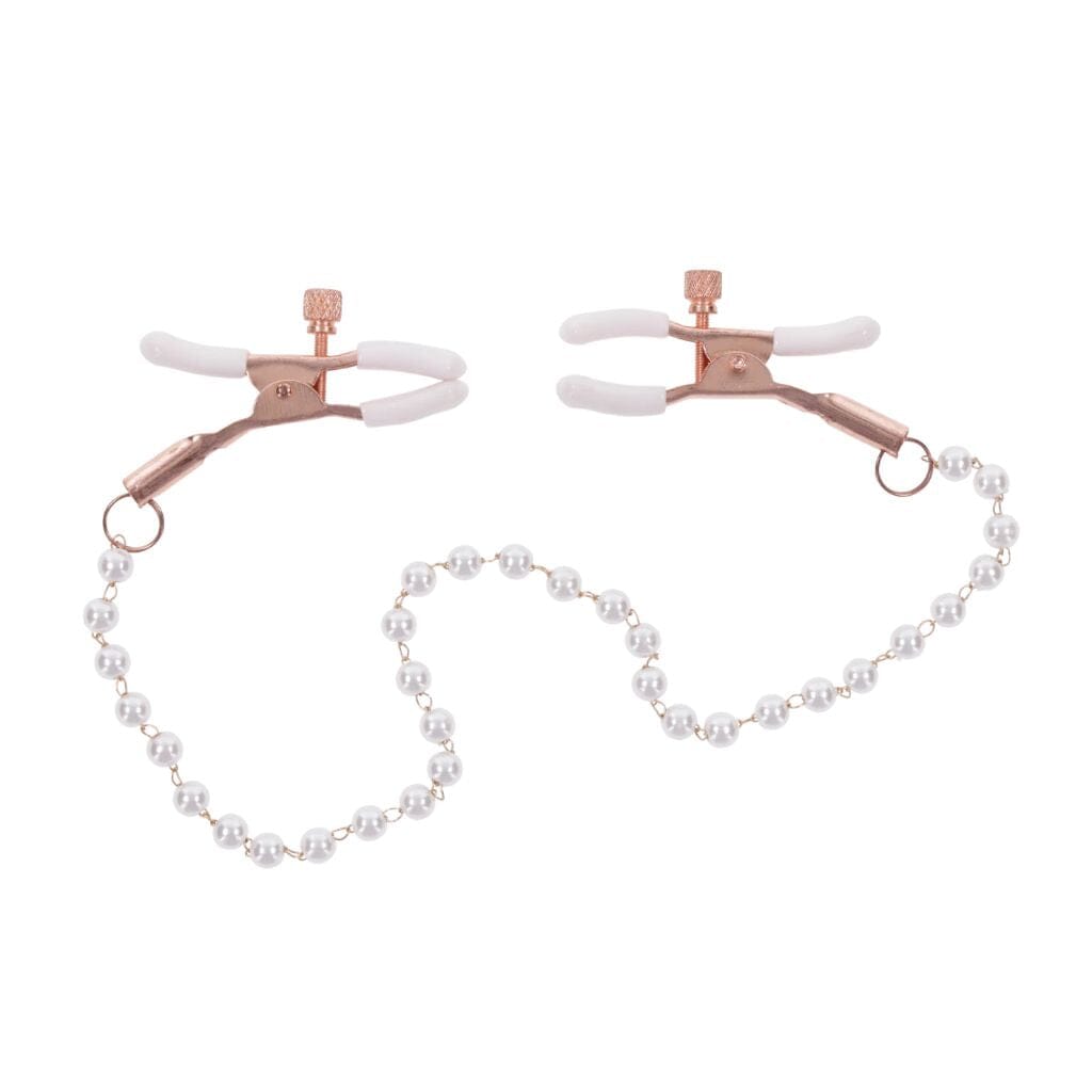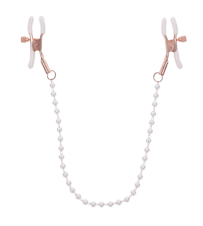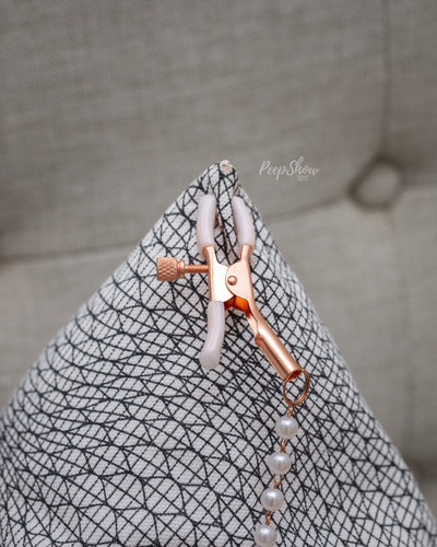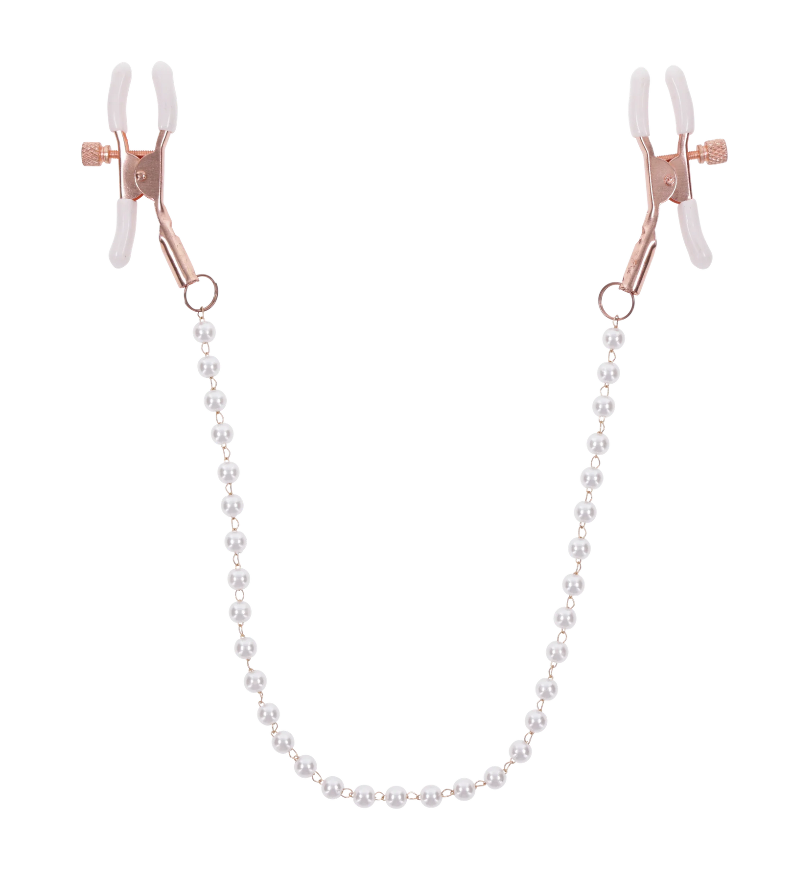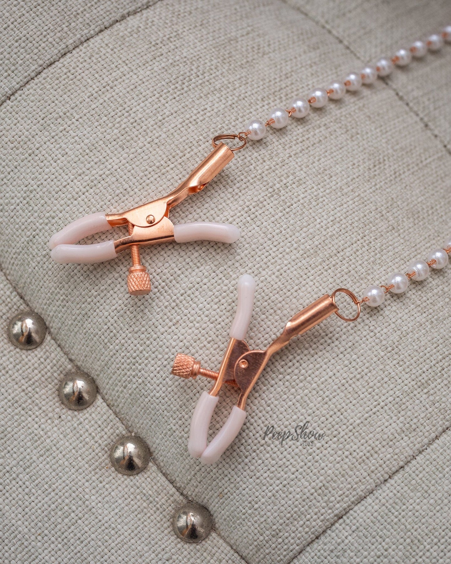 The Peaches N Creame Pearl Nipple Clamps dangle over the breasts, moving with your body. Cute rose-gold + faux-pearls shimmer,