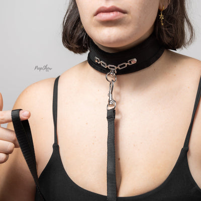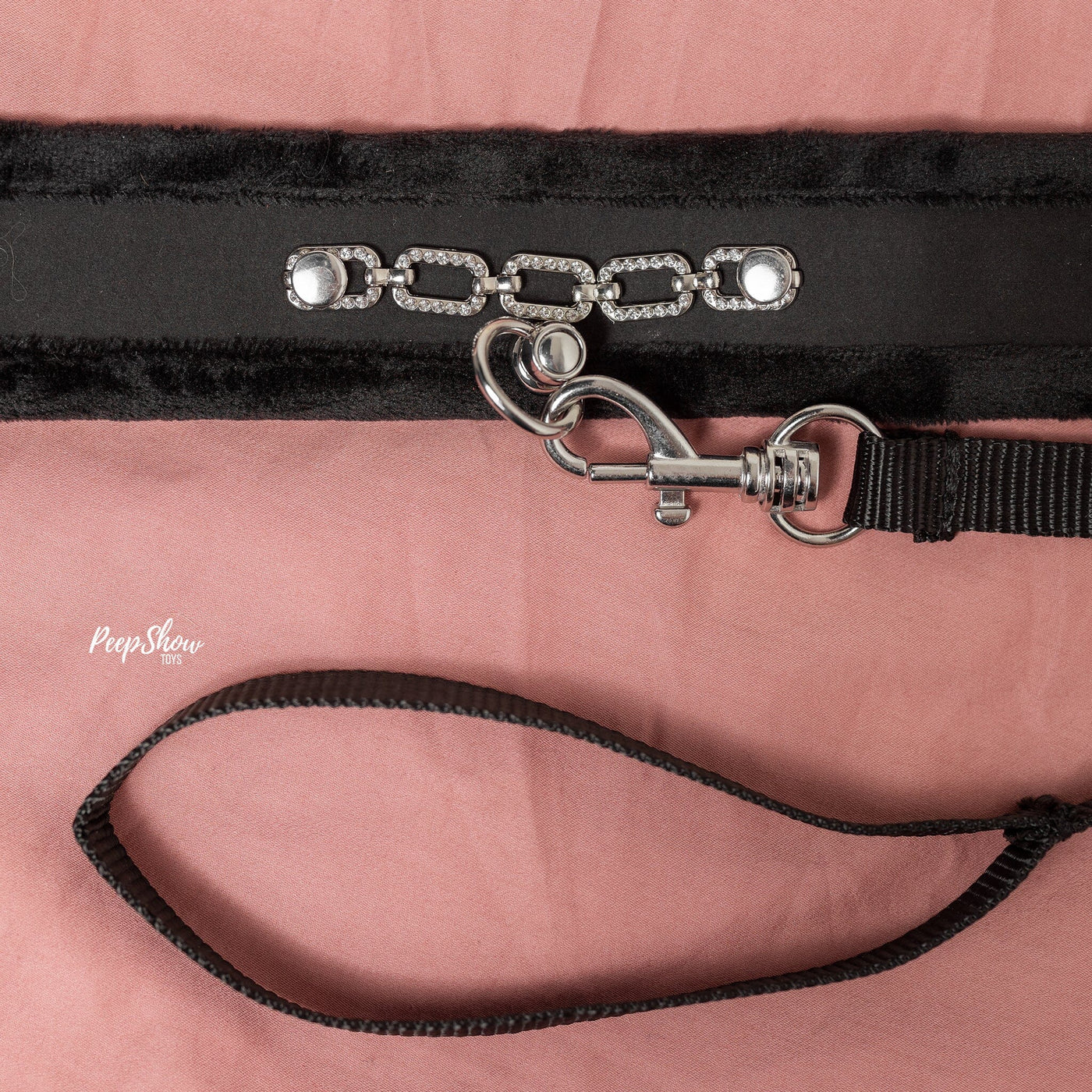 The Crystal Collar and Leash is a sexy step into BDSM... Its soft, plushy lining surrounds their neck, while the nylon leash holds fast.