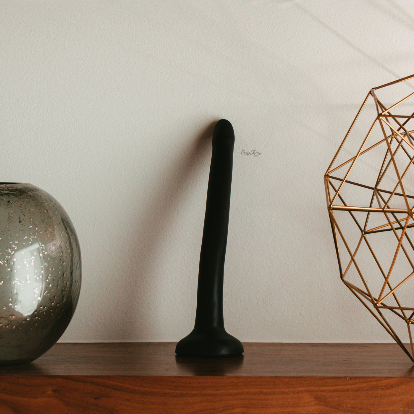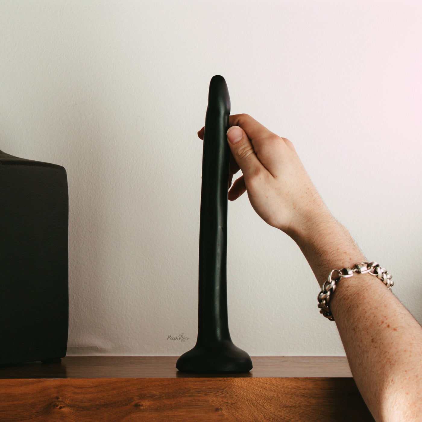 Cast from SquarePegToys®'s Firmer Black silicone, The Slim is smooth and flexible. This version provides slightly more resistance and less squish than the SuperSoft version, helpful for minimizing gag reflex.