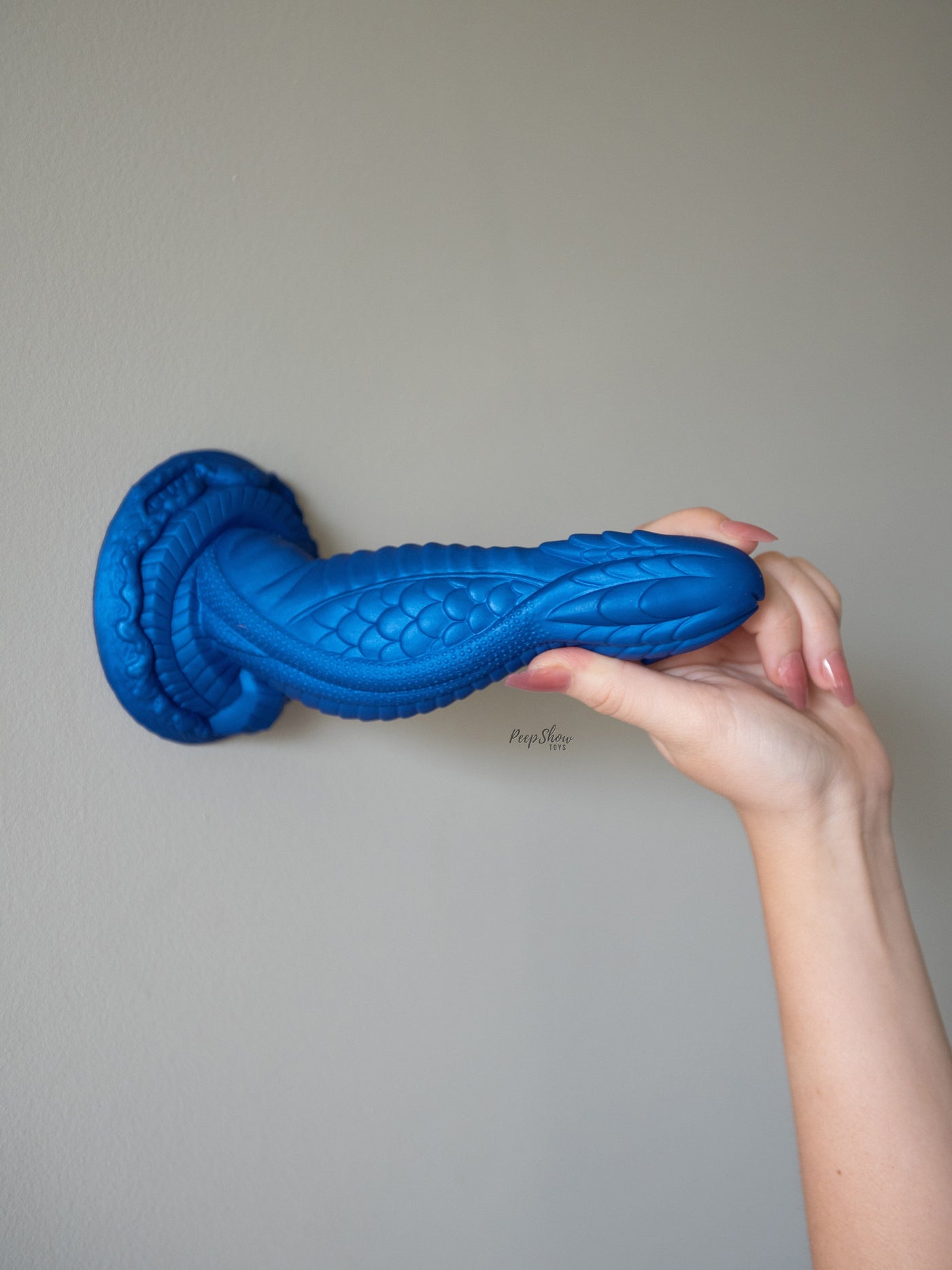 Beautifully metallic blue, the Symbiont's expansive girth gets thick: at 2.1 inches diameter in the knot-like bulge.