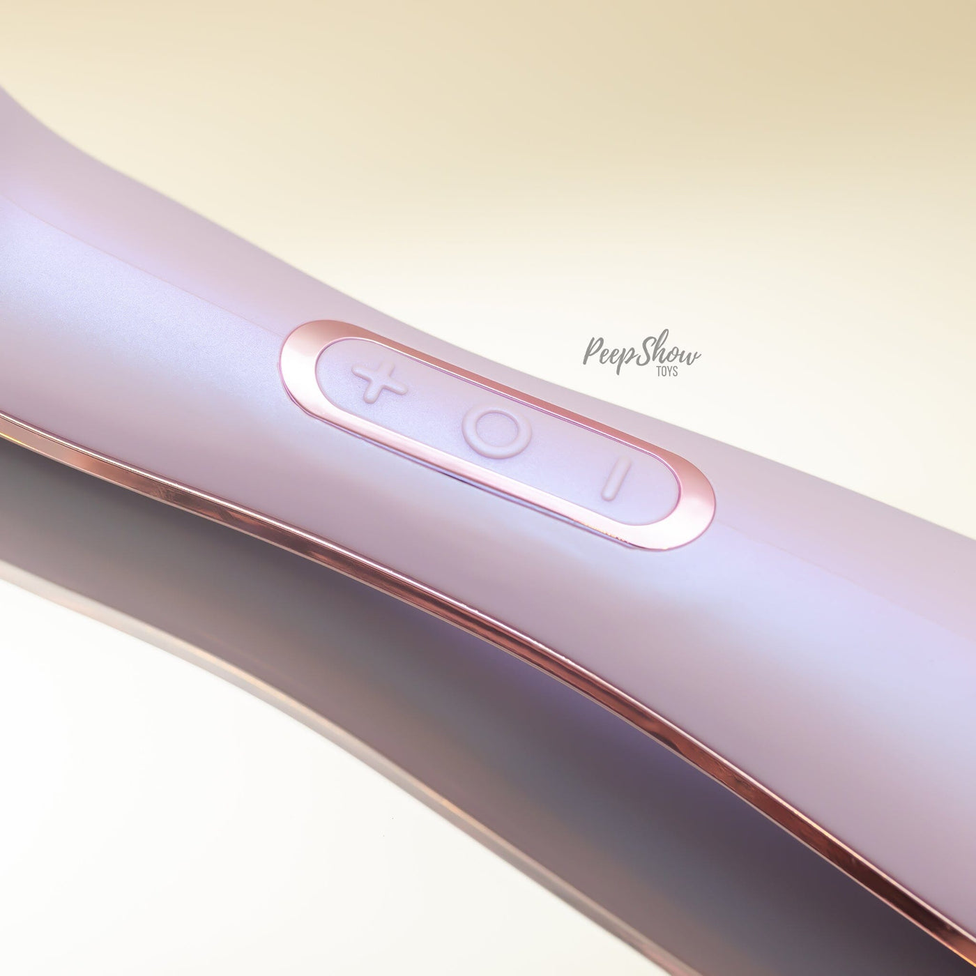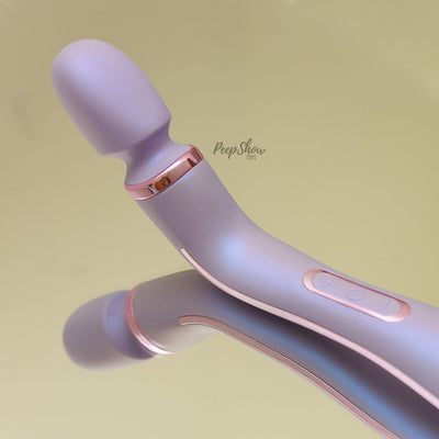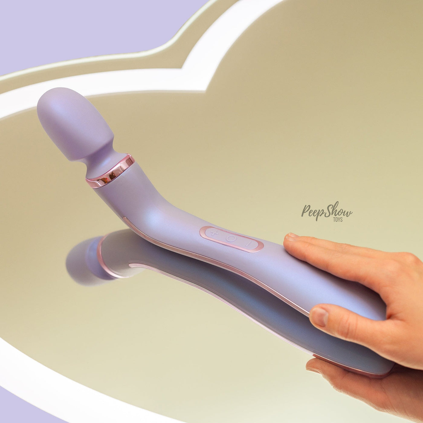Its ergonomic curve wraps around: over the shoulders for back and neck massage, or around the belly for clit and vulva stimulation!